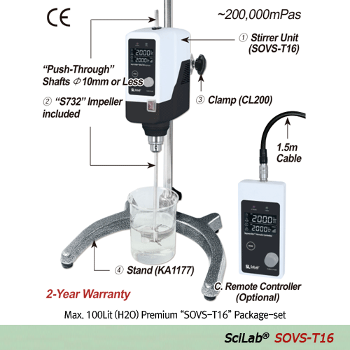 SciLab® Premium Hi-Torque Overhead Stirrer “SOVS-T16”, with Permanently Brushless Motor(BLDC), Max. 14:1, 200,000mPas  With Torque(Ncm)·Viscosity(mPas)·Temperature(℃)·Real Time Display, Optional Remote Control, Max. 2,000rpm  “Push-Through” Shaft(Φ10mm or > 교반기